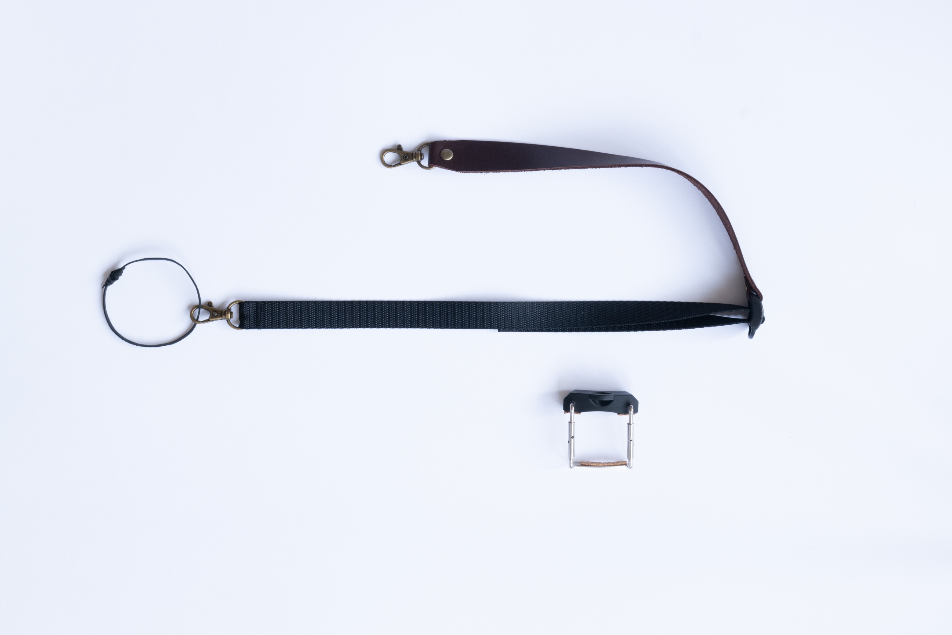 The strap attaches to our custom clamp, arcs around the neck and clips onto a small leather loop at the scroll, similar to a guitar or mandolin strap.